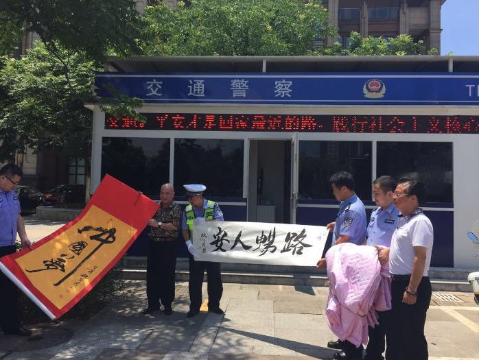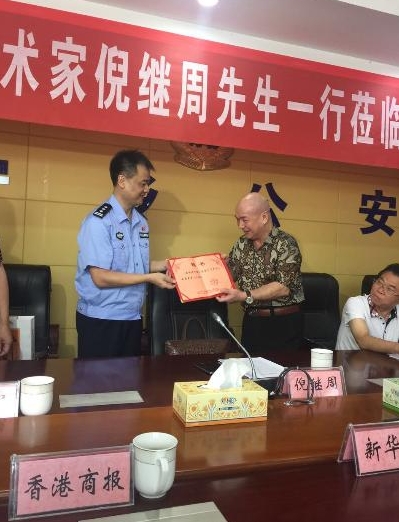 【香港商报网讯】记者唐勇平报道:7月18日上午,著名书画家倪继周与弟子曾昭才一道来到湖南宁乡市公安局,现场慰问了近期在抗洪抢险中成绩表现突出的宁乡公安集体,并携带自己精心创作的十幅书法作品和五十床空调被捐赠给宁乡公安受灾派出所和高温下执勤交警,并现场为宁乡公安书写了一大批书法精品。