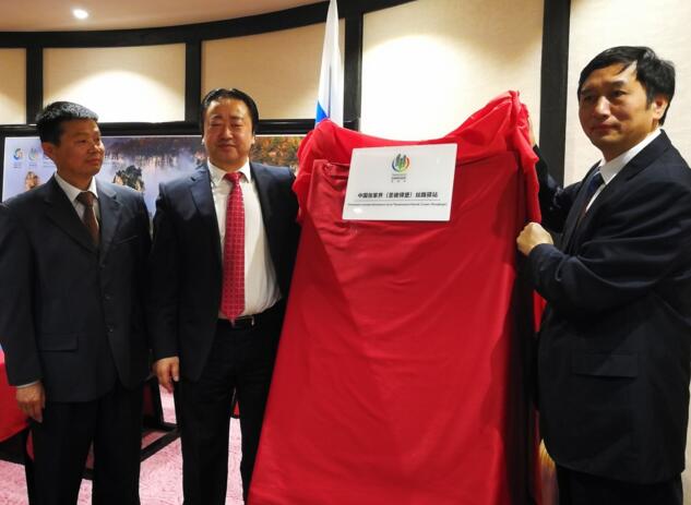張家界市政府副市長歐陽斌(右),俄中商務園總裁、俄中“一帶一路”戰略發展研究會執行主席陳志剛(中)為中國張家界(圣彼德堡)絲路驛站揭牌。