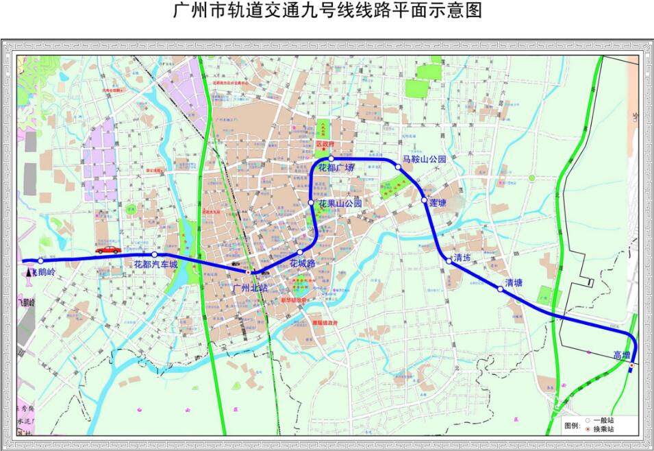 廣州地鐵九號線一期全長20.1公裏,線路覆蓋廣州白雲區和花都區,設飛鵝嶺、花都汽車城、廣州北站、花城路、花果山公園、花都廣場、馬鞍山公園、蓮塘、清㘵、清塘、高增等11座車站,其中,廣州北站與遠期八號線北延段換乘、高增站與三號線換乘。