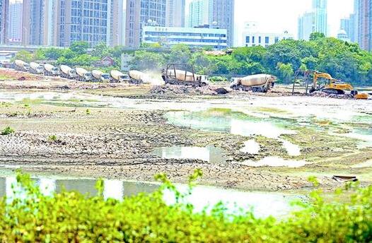 湖北日報訊 昨日,在武漢市漢陽馬滄湖,挖掘機在清理湖內淤泥,10多輛罐車排隊運走清出的淤泥。清淤工程預計年底完工。(記者倪娜 實習生郝玥雯 攝)
