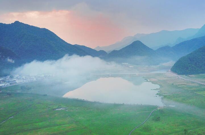 圖為航拍神農架大九湖景區晨霧繚繞,宛若畫卷。新華網 歐陽小潔 攝