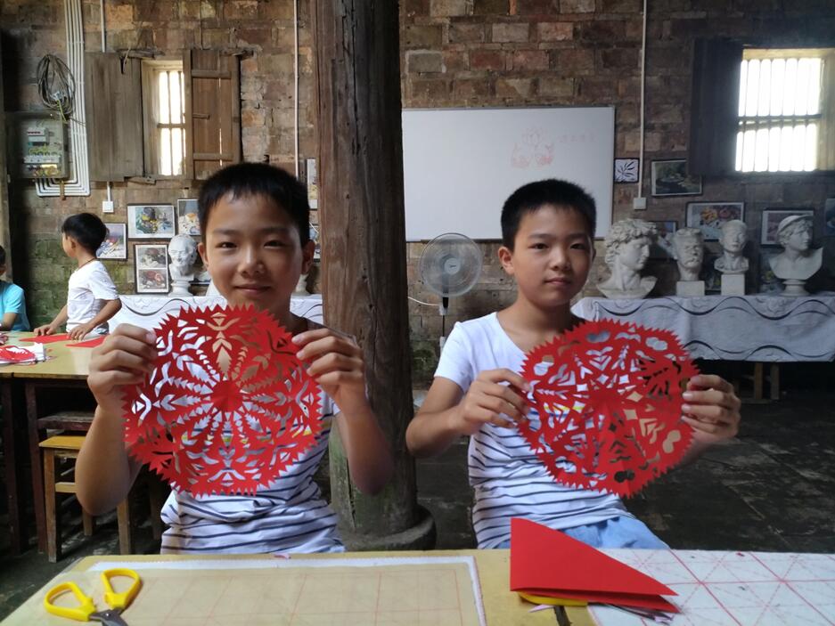 介源書院學生嚴子俊、嚴子豪向記者展示他們的剪紙。