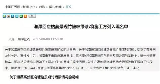 據了解,網友關注的景觀竹噴漆問題,發生在該區曉塘路綜合提質改造工程施工過程中。資料顯示:此項目於2016年12月通過湘潭高新集團公司公開招標,由長沙市政工程公司中標負責施工建設。2017年6月,在非機動車道和綠化帶實施中,長沙市政工程公司在該路段道路臨時種植景觀竹,受持續降雨及高溫天氣影響,景觀竹出現枯萎。7月12日,高新集團對施工方下達更換處理的整改通知書,但施工方為了應付工程竣工驗收,擅自對枯萎景觀竹做噴漆美化處理。7月25日,工程部發現此現象後再次下達整改通知書,施工方在8月3日完成重新種植。