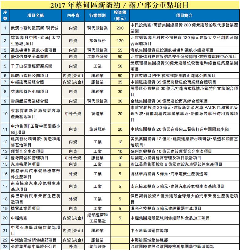 今年初,武漢市委提出全面啟動招商引資「一號工程」。蔡甸區主要負責人表示,該區秉承「綠水青山就是金山銀山」理念,圍繞全產業鏈、城市功能鏈、創新鏈進行招商,招強招大,招新招特,引進了一批創新性、引領性、標杆性的大項目好項目。