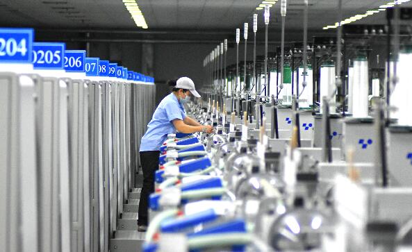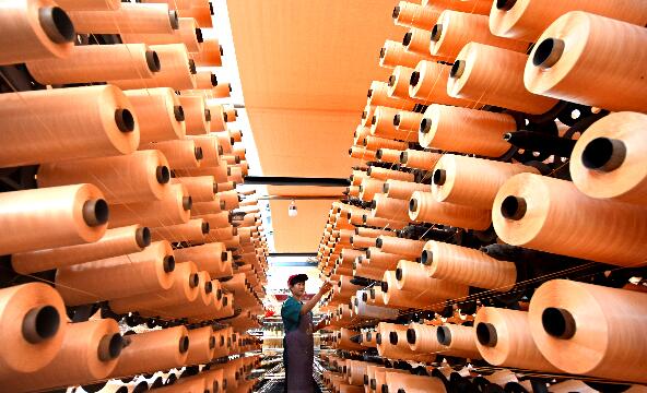 山东省沂源县历山街道一纺织企业的工人在生产出口纺织产品。