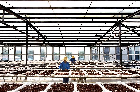 在山东省沂源县悦庄工业园,一果品企业的工人在生态阳光房里晾晒果脯。