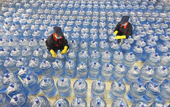 山东省沂源县鲁村镇一山泉水企业的工人在整理加工的桶装山泉水。