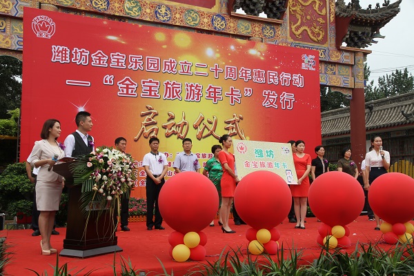 13日上午,潍坊金宝旅游年卡发行启动仪式在潍坊金宝乐园隆重举行。凭此卡可游览潍坊金宝乐园、金宝动物园、金泉寺、金宝艺术馆、昌邑(金宝)青山秀水景区、安丘(金宝)柘山乡情景区、坊子(金宝)乐高农场、昌乐(金宝)莲花山农庄小镇八个景点,真正实现了 “一卡在手,金宝畅游”。