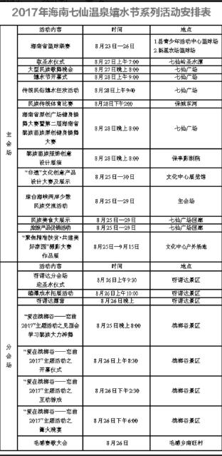 记者从日前召开的七仙温泉嬉水节新闻发布会上获悉,2017年海南七仙温泉嬉水节分别设保亭主城区保城镇主会场和呀诺达景区、槟榔谷景区、毛感乡3个分会场,其中主会场有取圣水仪式、嬉水节开幕式、大型民族歌舞晚会、传统民俗嬉水狂欢、海南省篮球联赛、民族传统体育比赛、海南省原创广场健身操舞大赛、民族美食大展示、非遗文化创意产品设计大赛及展示、黎族苗族服饰创意设计展演、聚焦精准扶贫摄影展、旅游产品促销活动、琼台海峡两岸少数民族文化交流等13项活动,形式更加多样,氛围更加浓郁。