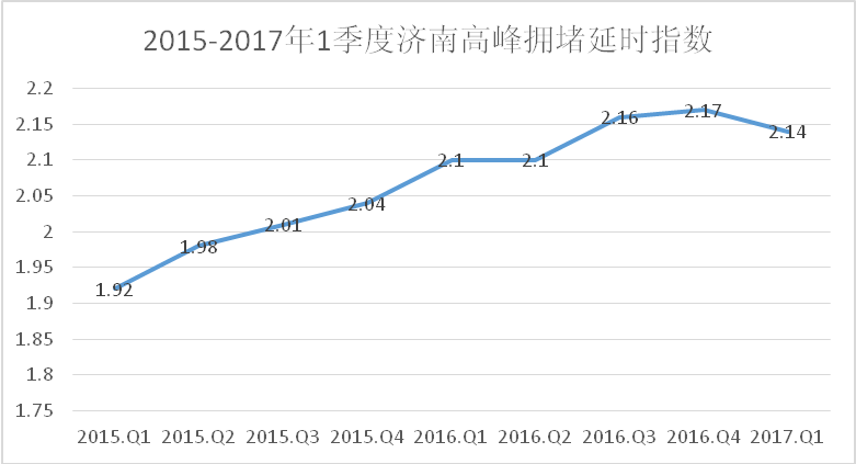 根據《2017年第一季度中國主要城市交通分析報告》顯示, 1季度,濟南通勤高峰平均車速20.18km/小時,高峰自由流速度43.11公路/小時。全天擁堵延時指數1.82,高峰擁堵延時指數為2.136,環比下降8.9%,在1季度33個同比上漲的城市中排名25名,擁堵增幅在逐漸減小。從擁堵區域分布來看,中心城區擁堵狀況明顯減弱,道路擁堵路段向東偏移。20條中心擁堵道路平均車速從原先的26.8公裏/小時,提高到了28.1公裏/小時,高峰擁堵延時指數平均下降4.8%,部分路段擁堵得到有效緩解。