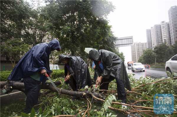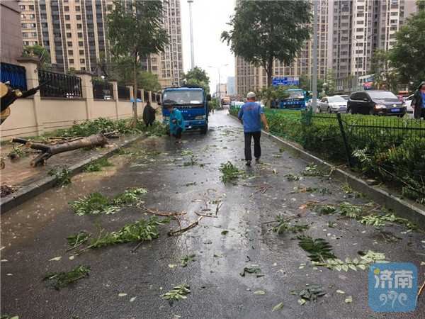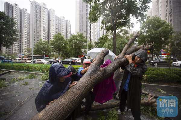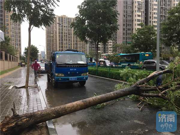 经过半小时左右的抢险,两棵横倒在齐州路西侧的树木被初步清理完毕。他们将清理下的树枝运到随行车辆上后,合力将树干推到人行道上,先把非机动车道清理出来以便市民通行。