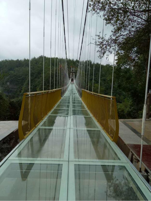 該景觀橋橋頭立柱似一雙張開的手臂托舉苗族圖騰元素牛角進行創意設計。設計橋長190米、橋面寬2.2米,橋面與溝谷高差120 米左右,橋面板為雙層夾膠高清全透明玻璃橋面板,共142塊玻璃,每塊玻璃厚度約4cm,重約500斤。