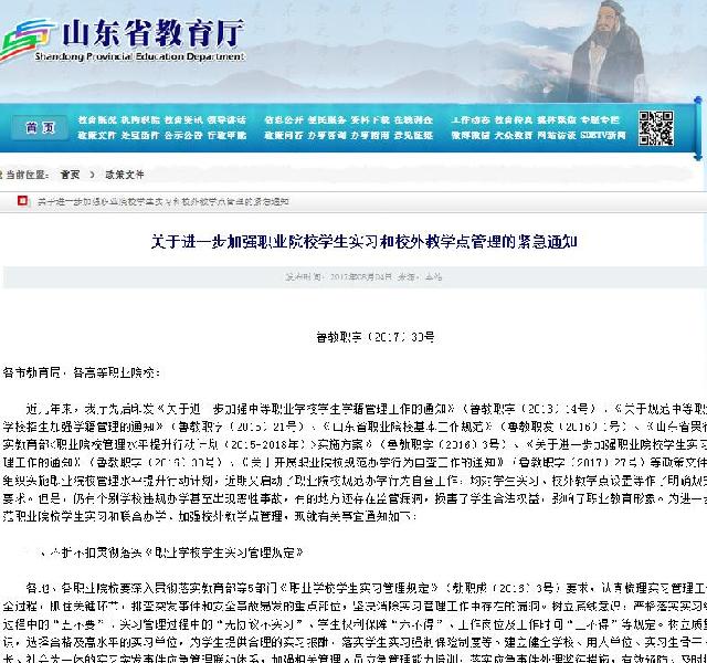 為進一步規范職業院校學生實習和聯合辦學、加強校外教學點管理,山東省教育廳發布關於進一步加強職業院校學生實習和校外教學點管理的緊急通知,要求的規范辦學行為自查工作,找出問題、逐項整改、消除隱患,堅決杜絕擅自設立教學點或聯合辦學、擅自延長學生頂崗實習時間、實習崗位與其所學專業面向的崗位群不一致等現象,並於2017年8月11日前將清查情況加蓋公章後報送省教育廳職業教育處。