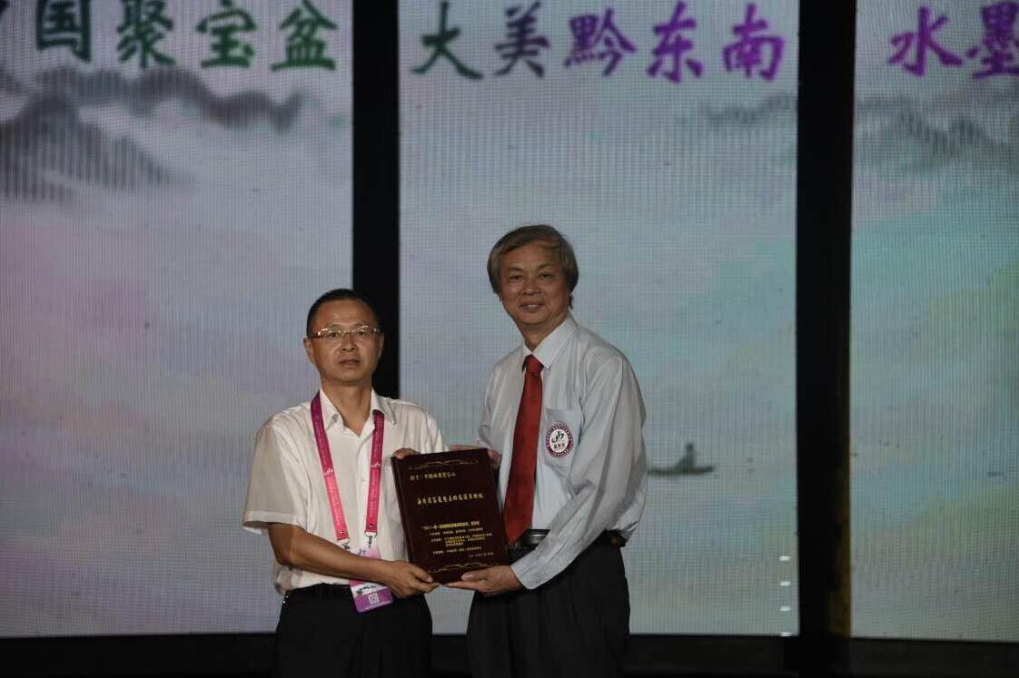 香港旅游业雇员总会名誉会长邓健民为施秉授牌“海外旅客最想去的内地旅游目的地“,施秉县长张双红(左)接。 冉勇 摄