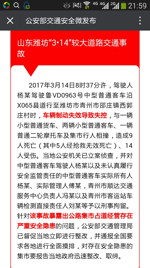 2017年3月14日8時37分許,駕駛人楊某駕駛魯VD0963號中型普通客車沿X065縣道行至濰坊市青州市邵莊鎮西郭莊村時,車輛制動失效導致失控,與一輛小型普通貨車、兩輛小型普通客車、一輛普通二輪摩托車及集市行人相撞,造成9人死亡(其中5人經搶救無效死亡)、14人受傷。