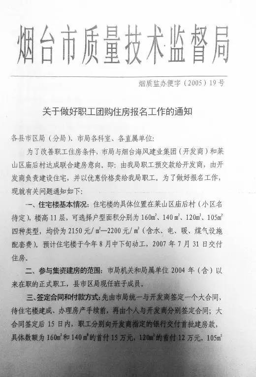 老於只是受害職工之一,記者了解到,參與這起團購建房項目的煙台“五大局”的職工有1200餘名。來自煙台市地稅局的老王告訴記者:“當時局裏專門下過文件,科級幹部享受160平方米,普通員工享受120平方米等等,要求很詳細。我們把錢先交給單位財務,再由財務轉給海風置業。”