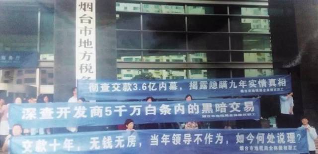獲悉此事後,千名公務員開始走上了漫漫維權路,遊行、上訪、聲討開發商。其中,在2015年,煙台市地稅局數百名被騙公務員在辦公樓前身著制服、拉起橫幅維權,一直堅持了一個月。