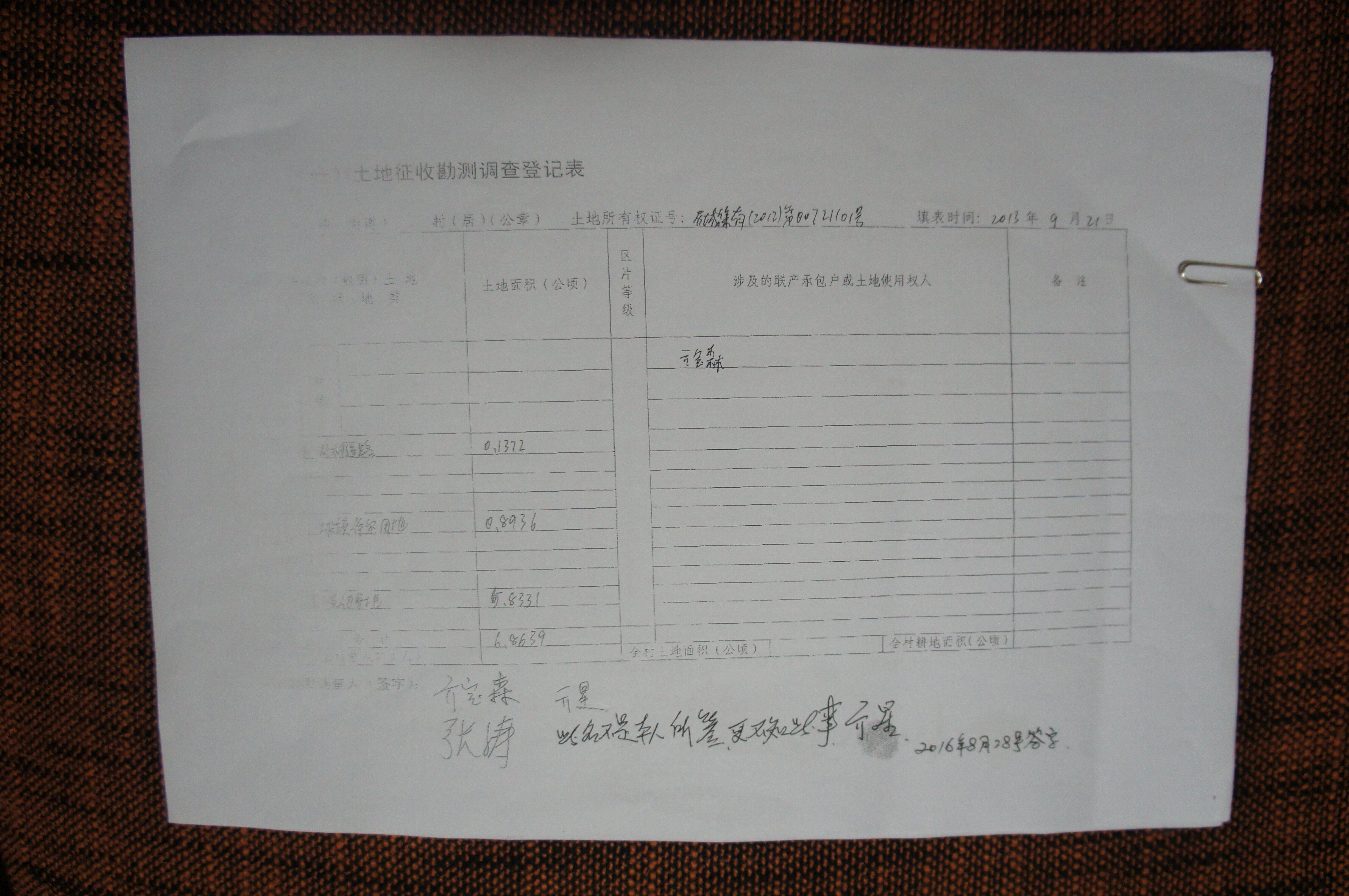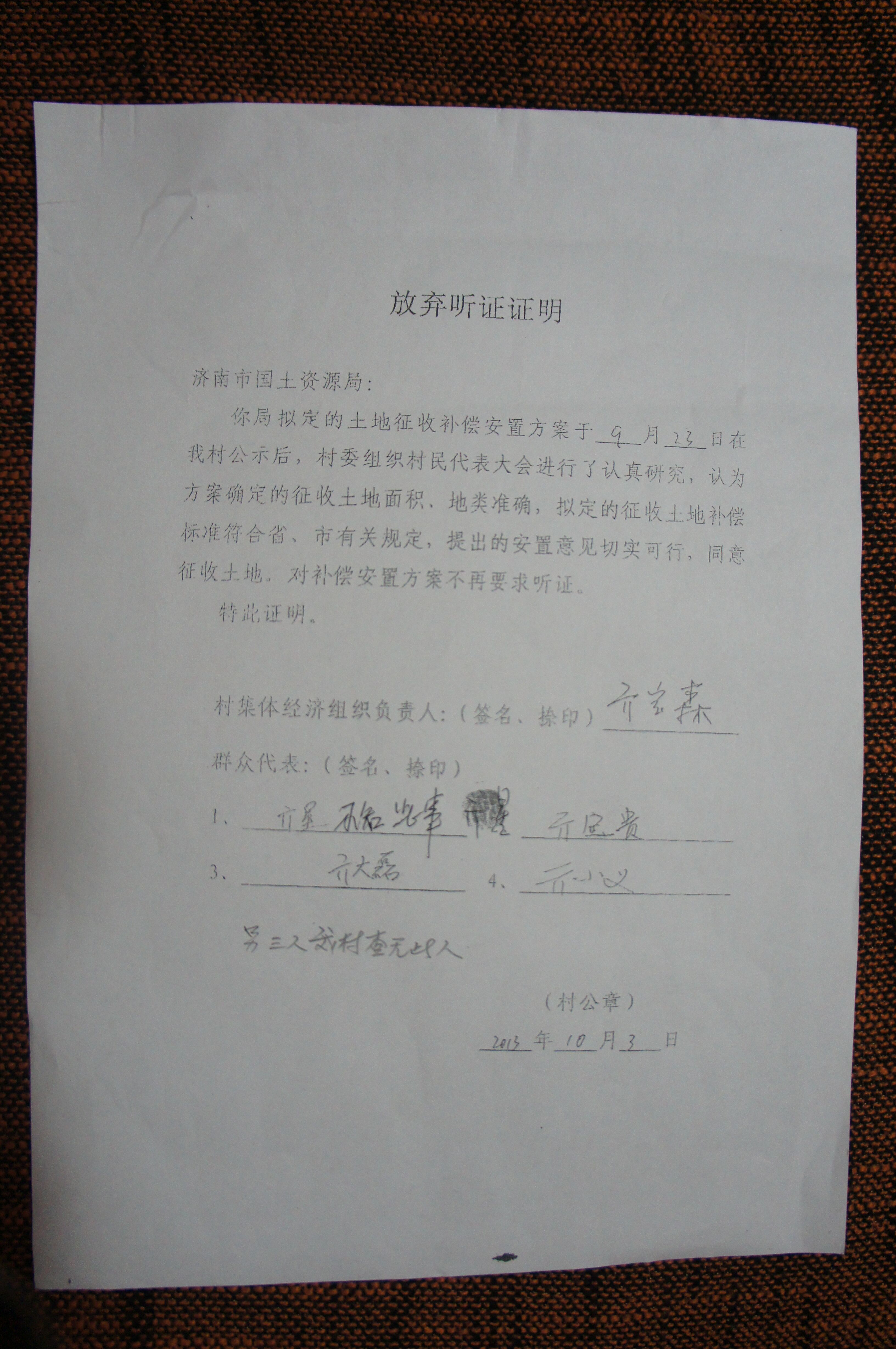 村民放棄聽證、代表簽字純屬造假。記者調閱該村2013年9月25日填寫的土地征收勘測調查登記表和2013年10月3日簽字的放棄聽證證明,發現上面皆有村民“亓星”的簽字。記者找到亓星,他明確表示,字不是他簽的,自己對此事毫不知情。在隨後進一步的調查中,記者發現,放棄聽證證明上共有4位村民簽字同意,4人中只有亓星是本村人,其餘3人的名字在亓家莊村查無此人。對此,記者追問曆城區國土資源局和華山街道國土資源所,被告知《土地征收勘測調查登記表》是由村委會提供的,勘測由第三方技術單位實施,登記表是村裏填寫的。記者拿出該村放棄聽證的造假證明材料,問其有沒有核實過?張磊、李智沒有直接做出解釋,隨後承認在征地程序上確實存在瑕疵。