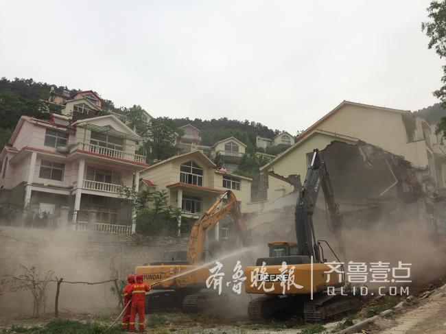 早上6點,機械人員就已全部就位,拆除工作立即開始。為盡快完成拆除工作,10輛挖掘機同時作業,在別墅群的不同位置同時開工。附近駐山部隊主動派出高壓水車,為拆除工作降塵。