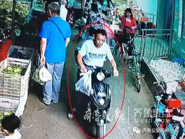 天橋警方經過偵查,確定嫌疑人為男性,年齡約50歲,中等身材,上身穿灰白色圓領T恤衫(T恤衫正面印有“MAN JEEP”字樣),腳穿白色襪子、拖鞋,案發時騎一輛帶後備箱的黑色電動車(視頻截圖圈定的騎車男子即為嫌疑人)。