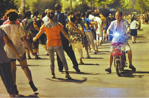 魯網6月28日訊每晚8點到10點,京滬高鐵途經黨楊路的乘客總能看到這樣的場景:自黨楊路與劉長山路的交叉口向南,占滿路西一側非機動車道的廣場舞隊伍綿延200餘米長。如果細分的話,其中有秧歌、交誼舞、新潮的seve舞,當然傳統所稱的廣場舞規模最大。每隔八九米就有一台曲風迥異的音箱把他們劃分成不同隊伍,唯一看似一致的是他們大都五六十歲的年紀。