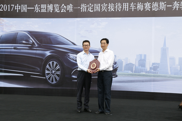 【香港商報網訊】記者歐陽萍報道:9月4日,2017中國—東盟博覽會唯一指定國賓接待用車交車儀式在廣西南寧國際會展中心舉行。奔馳長軸距E級轎車成為本屆東博會唯一指定國賓接待用車。廣西壯族自治區副主席、“兩會”指揮中心總指揮張曉欽出席交車儀式並向北京梅賽德斯-奔馳銷售服務有限公司南區高級銷售經理譚國豪先生頒發榮譽牌匾。