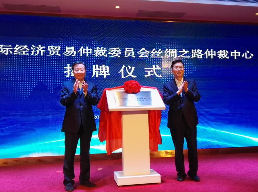 中國貿促會會長薑增偉、陝西省副省長魏增軍為絲綢之路仲裁中心中心揭牌。