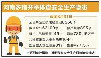 河南省各地及有关部门坚持大检查与严执法相结合,加大隐患排查治理力度,依法严厉打击各类违法违规行为,彻底整治了一批重大事故隐患。截至8月31日,全省共派出执法检查组8566个,检查企业63109家,停产整顿895项,暂扣、吊销证照149个,罚款780.15万元;共排查出重大安全隐患104个,已整治81个,整治率77.5%。