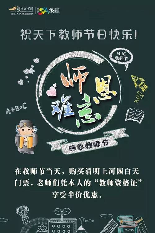 在教师节当天,购买清明上河园白天门票,老师们凭本人的“教师资格证”享受半价优惠。