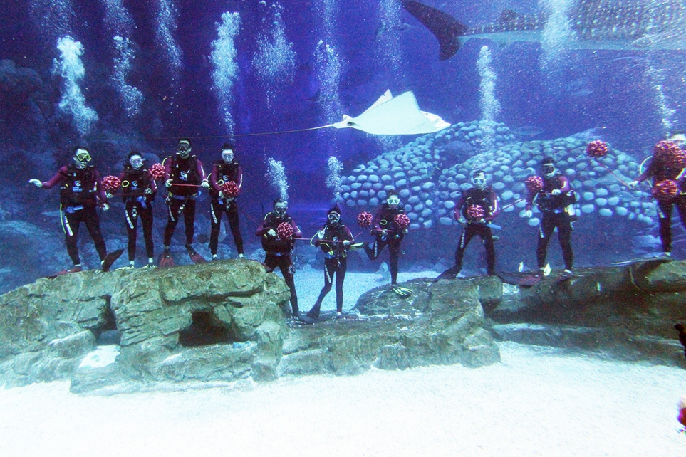记者在现场透过鲸鲨馆长39.6米、高8.3米、厚0.65米的巨大亚克力玻璃观赏屏看到,潜水达人们摆动着熟练的潜水泳姿,与鲸鲨嬉戏同游,多条鲸鲨好奇地在深潜高手身边旋转穿梭。有的达人钟情于追逐锤头鲨、魔鬼鱼,勇敢地亲近常人看来带着危险气息的大型鱼类,有的随着千年绿海龟,享受真正的海底“慢步”,玩得不亦乐乎。人与海洋动物自由互动的震撼场景,引来现场游客的阵阵惊呼。