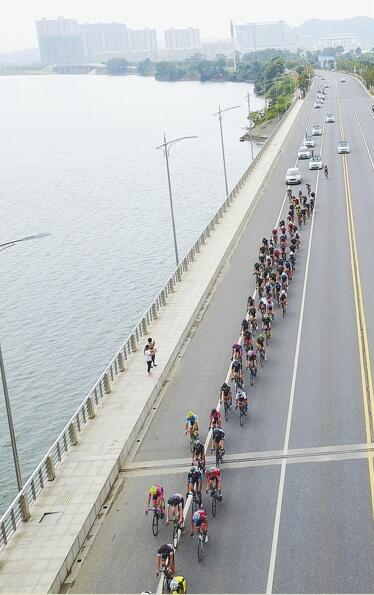 9月12日,参加第八届环鄱阳湖国际自行车大赛的选手们骑行在风光旖旎的武宁县庐山西海湾畔。