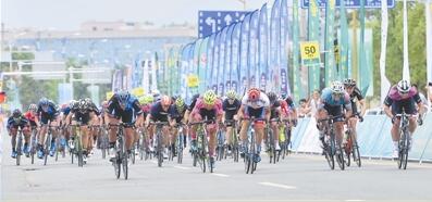 9月12日,参加第八届环鄱阳湖国际自行车大赛的选手们在最后冲刺。