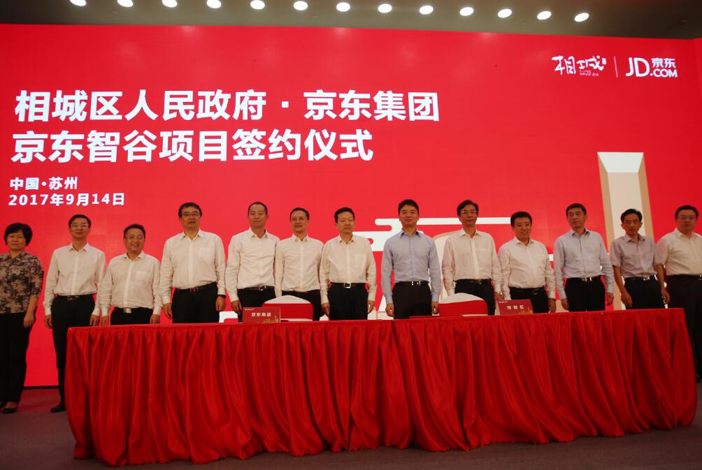 【香港商報網訊】9月14日下午,相城區政府與京東集團——京東智穀項目簽約儀式在相城區會議中心舉行。蘇州市委書記周乃翔,京東集團董事局主席兼首席執行官劉強東,京東集團副總裁黃東升,蘇州市委常委、常務副市長王翔等共同見證了簽約儀式。
