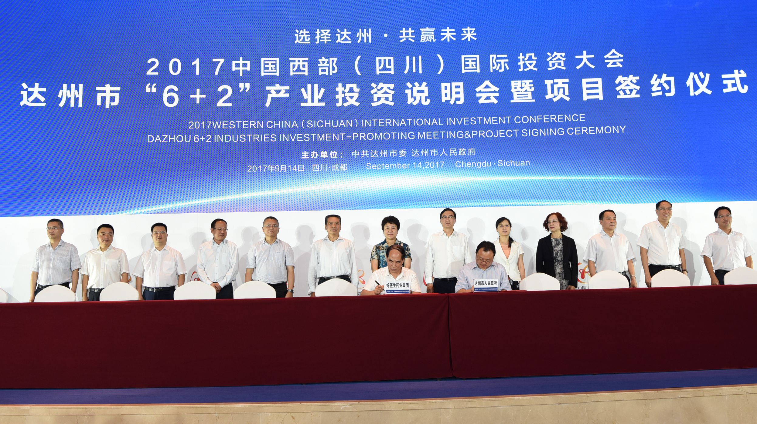 【香港商報網訊】記者梅超報道:14日下午,在第二屆中國西部國際博覽會進出口商品展暨中國西部(四川)國際投資大會將在成都開幕前夕,達州市在成都舉行“6+2”產業投資說明會暨項目簽約儀式,深圳國信達科技股份有限公司、北京中康凱利股份有限公司、好醫生藥業集團等知名企業應邀參會。簽約儀式上達州與知名企業簽訂投資合作項目53個,投資額486億元;現場集中簽約了深圳國信達科技新能源汽車及液晶電視周邊線材生產項目,中康凱利賨人穀特色小鎮項目等17個項目,投資額189億元。會上達州市人民政府還與好醫生藥業集團簽訂了健康產業項目合作框架協議。