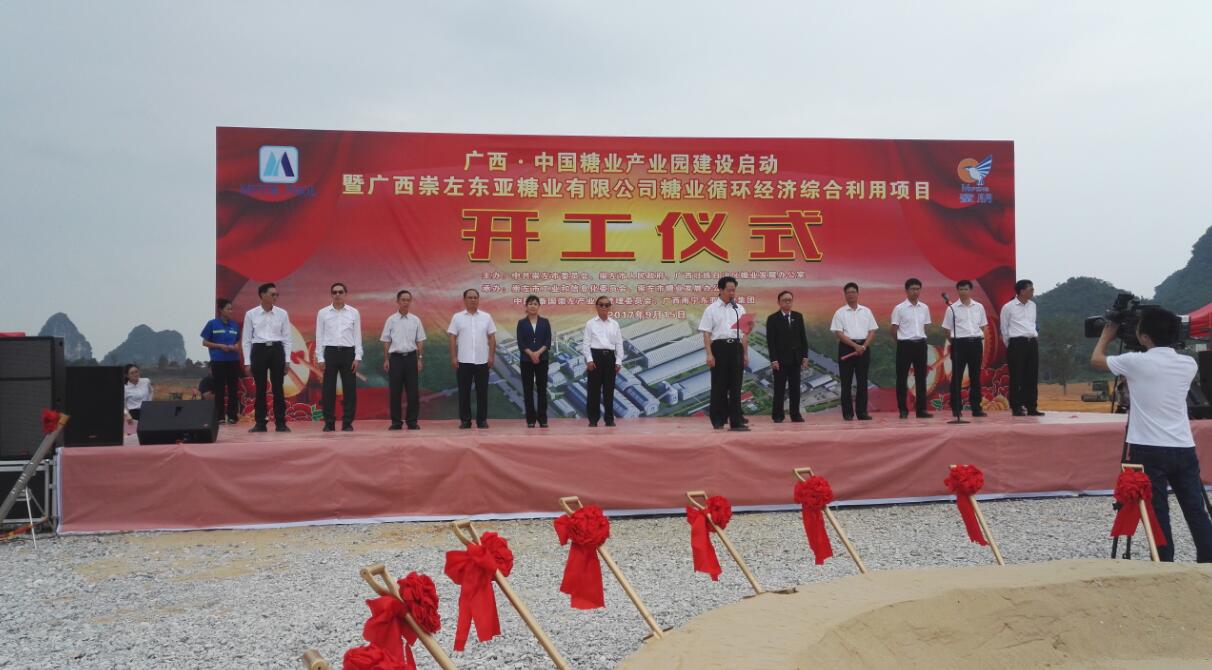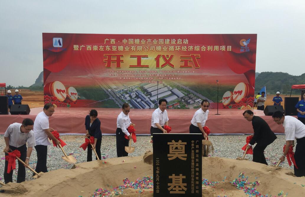 據悉,當天開工建設的廣西崇左東亞糖業有限公司糖業循環經濟綜合利用項目計劃總投資27.48億元,總用地面積1437畝。項目分兩期建設,其中第一期總投資為21.5億元,計劃2018年11月底建成投產,包括:崇左東亞糖廠搬遷後進行擴能並直接升級成為二步法,建設一條處理甘蔗能力為20,000噸/日原糖生產線及一條溶糖能力1,200噸/日精糖生產線、建設一個30MW生物能源電廠。