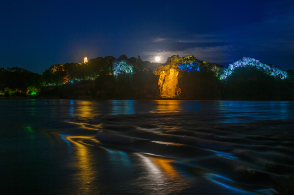 “夜游三江”的主要内容是“游船、游山、游城”。“游船”是从乐山大佛景区八仙洞码头到岷江二桥。沿途可观古色古香的建筑、流光溢彩的大桥、伟岸壮美的睡佛,“任性”饱览“夜嘉州”的华彩乐章,还能品禅茶、听民乐、赏演艺,感受岷江、青衣江、大渡河水域别样的文化特色。