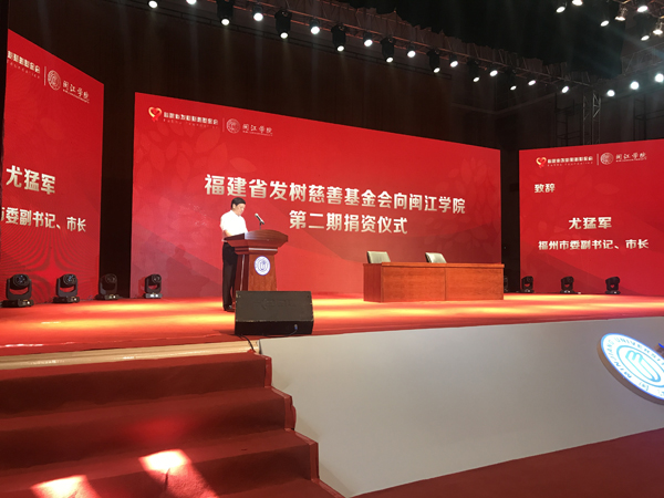 福州市委副书记、市长尤猛军在捐赠仪式上致辞,代表福州市政府,向陈发树先生捐资助学、回报社会的善举致敬。他同时表示,希望闽江学院不断提高办学质量,早日成为顶尖学府,助力福州实现新发展。