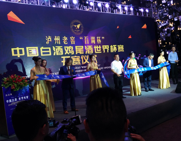 中国酒协副理事长兼秘书长宋书玉(右三)、泸州老窖股份有限公司党委书记、董事长刘淼(左四)、成都调酒师协会会长许忠镇(左二)共同为中国白酒鸡尾酒大赛启动仪式剪彩