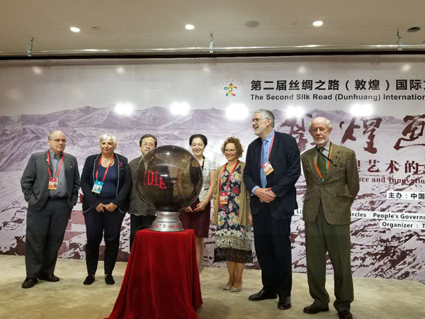 甘肃省委常委、宣传部长陈青女士(中)与国内外嘉宾共同见证“数字敦煌”资源库英文版上线