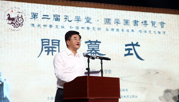 开幕式上,贵州省委常委、省委宣传部长慕德贵在致辞中说,本届孔学堂.图书博览会以传承中华文脉,弘扬中华文明,品读国学经典、增强文化自信为主题,符合是潮流,顺应人民的期待。贵州把举办国学图书博览会和孔学堂的建设结合起来,成功的举办了首届孔学堂图书·博览会,填补了国内国学专业图书博览会的空白,齐聚国内的资源,集中展示优秀传统文化的出版成果。创作出「长征在贵州伟大的转折系列」等一系列优秀的出版作品,88种图书输送到美国、英国、德国、法国等多个国家以及香港等地区,搭建中华优秀传统文化展示、交流、传播的平台,推进了世界多种文明的交流,获得社会一致好评。博览会推动了贵州全民阅读活动的广泛的开展,贵阳跻身为全国「三大数字阅读城市」,书香贵州洋溢着浓郁的文化的气息,与贵州经济社会协同发展,展现勃勃生机。