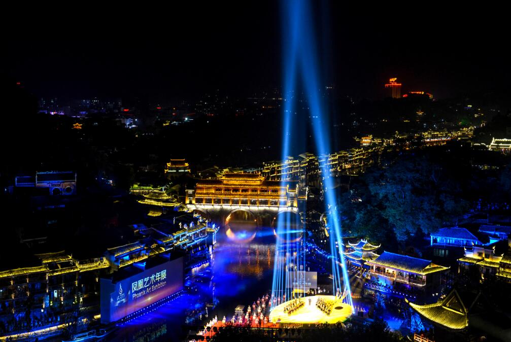 22日晚的鳳凰古城沱江河兩岸燈光璀璨、人流如潮。一場以鳳凰古城吊腳樓和虹橋為主背景、遊船為道具、沱江為舞台,融合彙聚湘西經典民族文化藝術、現代建築投影、裸眼3D技術的首屆鳳凰藝術年展頒獎晚會,讓數萬名嘉賓和遊客深深感受到中國藝術之美。
