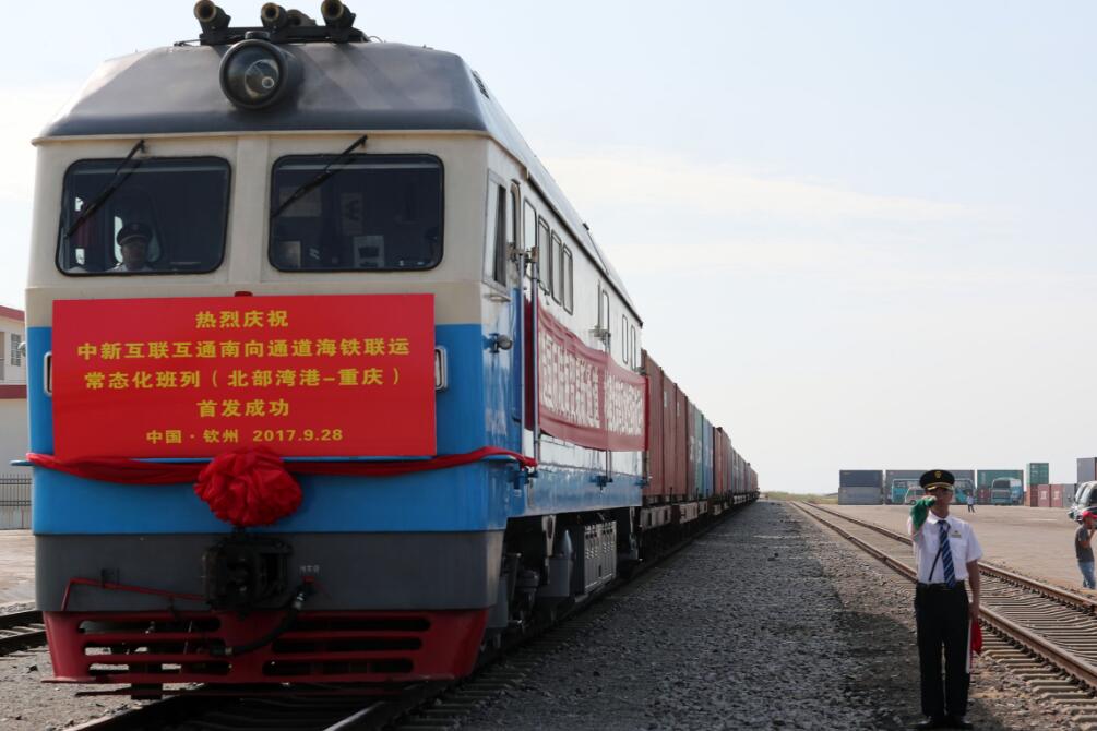 【香港商報網訊】記者歐陽萍、通訊員黃有賢報道:9月28日上午,中新互聯互通南向通道海鐵聯運上行(北部灣至重慶)首趟班列從廣西欽州港東站鳴笛開行,發往重慶團結村站。稍早之前,從重慶團結村站發出的首趟下行(重慶至北部灣)班列剛剛抵達北部灣港。雙向班列的開通,標志著我國西部地區第一條南北縱向國際貿易物流大通道正式運行,也標志著中新互聯互通南向通道海鐵聯運班列正式進入常態化運行階段。