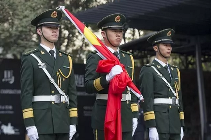 三位来自武警部队的特邀旗手护卫着鲜艳的五星红旗入场。