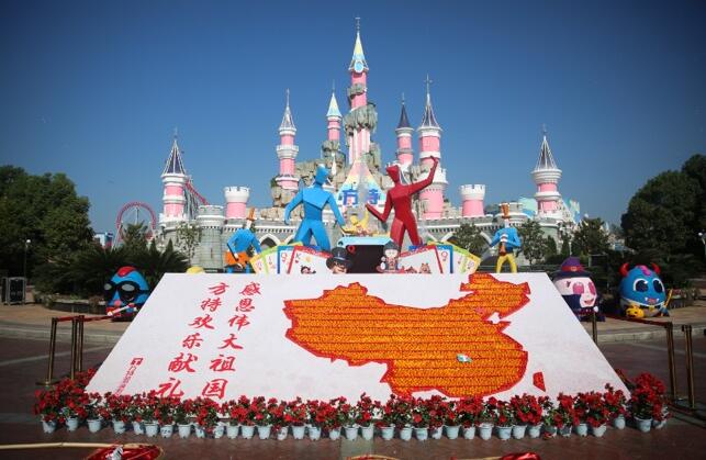 金秋十月,丹桂飘香,今天,我们迎来了祖国68周岁华诞,株洲方特选择了最甜美的方式为祖国母亲庆生。方特欢乐世界卡通城堡的喷泉前方,一副宽6.8米、高3米,由新鲜水果拼成的巨型中国版图展现在游客的眼前,这不仅代表着喜迎丰年、硕果累累,还代表着热情勤劳、坚韧的三湘儿女为祖国68周岁生日献礼的美好心愿。
