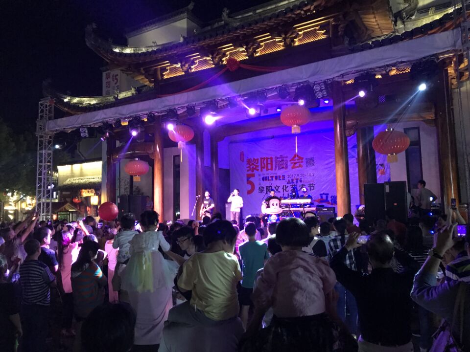 當晚七點半,黎陽in巷景區古戲臺迎來開幕式演出,來自國內知名的AE86樂隊、從野樂隊、青年公社樂隊等先鋒樂隊,一一登場震撼開唱,為來往游客帶來時尚活力、激情澎湃的音樂現場,掀起本屆文化藝術節第一波熱浪。