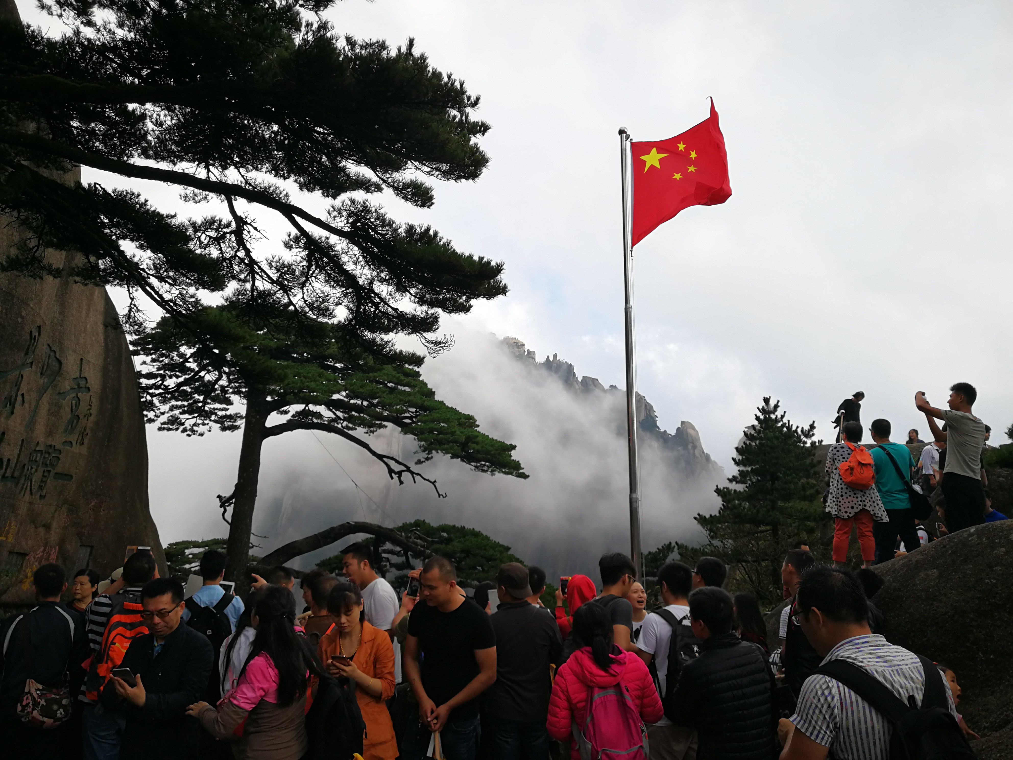 今年,國慶、中秋佳節雙節喜相逢,假期疊加構成長達8天的超級黃金周。上午十時,稚嫩的童聲從人群中傳來,人們尋聲望去,一名身穿紅裙的小女孩在迎客松旁唱起《歌唱祖國》,當唱完“歌唱我們親愛的祖國,從今走向繁榮富強”時,《義勇軍進行曲》奏響山頭,在莊嚴的國歌聲中,五星紅旗緩緩升起,所有人行注目禮,肅穆的氛圍下卻難掩內心的激動,游客們齊唱國歌,迎客松在黃山之巔傲然挺立,國旗迎風飄揚。