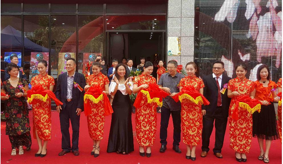 海南超时光科技有限公司董事长吴英汝(左五)、深圳创思特公司总经理石耀忠(右五)等嘉宾出席剪彩仪式。