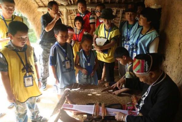 双节期间游客在槟榔谷黎苗文化旅游区观看黎族阿婆织黎锦。