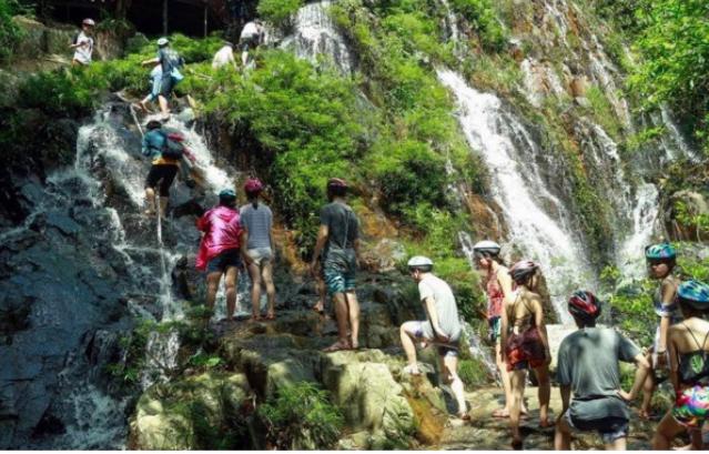 双节期间游客在呀诺达雨林文化旅游区体验踏瀑戏水。
