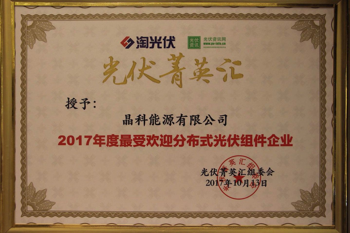 【香港商报网讯】记者万柔报道:10月13日,在无锡召开的2017中国分布式光伏经销商千人大会上,全球领先的光伏企业晶科能源凭借对创新技术上的极致追求与产品品质的匠心雕琢荣膺“2017年度最受欢迎分布式光伏组件企业”称号。来自全国各地的上千位代理商共同见证了晶科能源这一业内领导品牌在分布式光伏领域取得的闪耀成就。